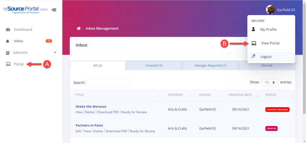 The Portal option will direct you to the reSource Portal! page. It enables you to directly access the reSource Portal! page from the Navigation Menu.