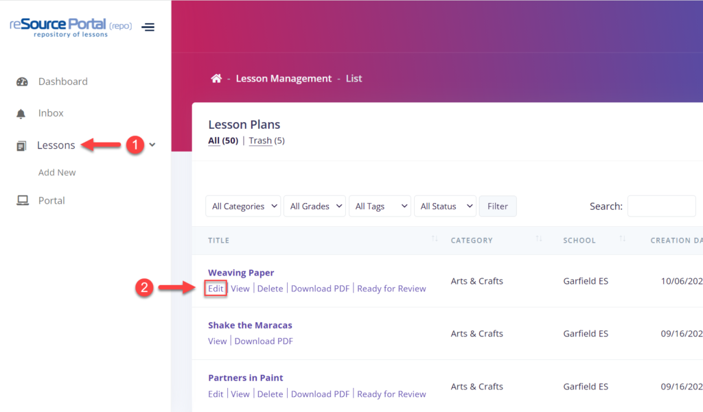 - Find the Lesson Plan that you want to edit and click its Edit option.