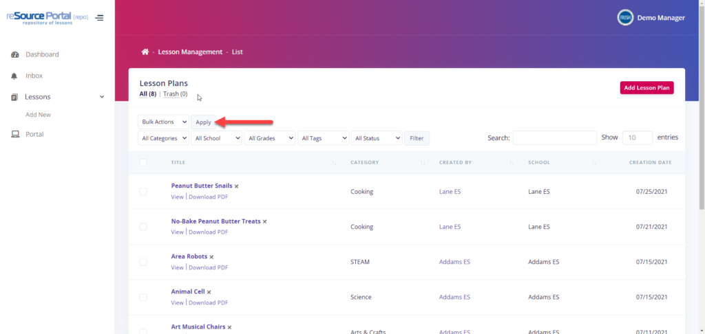 - Filters by Category, Grades, Tags, or Status: these drop-down filters enable you to narrow the list of displayed lessons based on the applied filters.